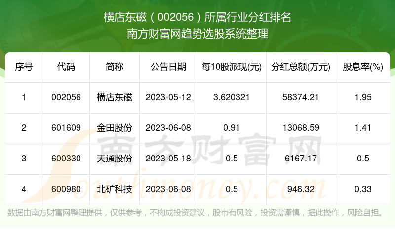 横店东磁最新一次公布的分红方案为10派3.620321元。本次权益分派股权登记日为2023年5月18日,除权除息日为2023年5月19日,派息日为2023年5月19日。