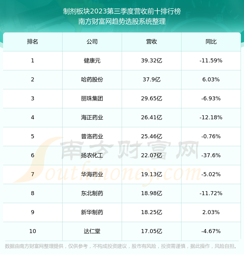 按照南方财富网趋势选股系统统计,该股所属板块为制剂板块,该板块共有36只股票,健友股份2023第三季度营收在该板块中排名为第36名,该板块2023第三季度营收排名前十的股票如下表:
