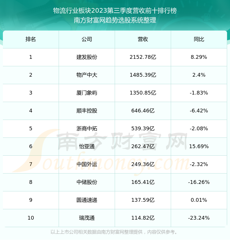 按照南方财富网趋势选股系统统计,该股所属板块为物流行业板块,该板块共有57只股票,音飞储存2023第三季度营收在该板块中排名为第49名,该板块2023第三季度营收排名前十的股票如下表: