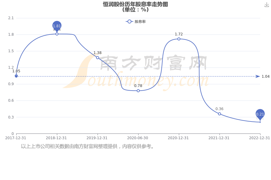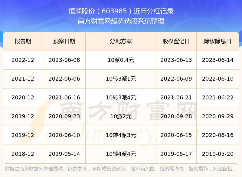 恒润股份最新一次公布的分红方案为10派0.4元。本次权益分派股权登记日为2023年6月13日,除权除息日为2023年6月14日,派息日为2023年6月14日。