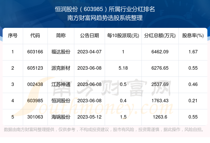按照南方财富网趋势选股系统统计,恒润股份所属行业为锻件行业,锻件行业分红排名情况如下表: