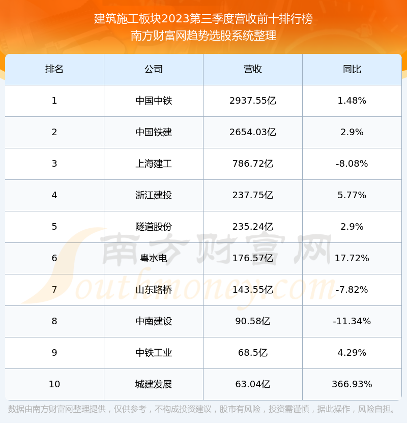 按照南方财富网趋势选股系统统计,该股所属板块为建筑施工板块,该板块共有26只股票,浦东建设2023第三季度营收在该板块中排名为第11名,该板块2023第三季度营收排名前十的股票如下表: