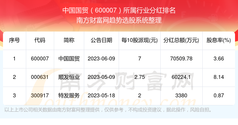 按照南方财富网趋势选股系统统计,中国国贸所属行业为物业租赁行业,物业租赁行业分红排名情况如下表: