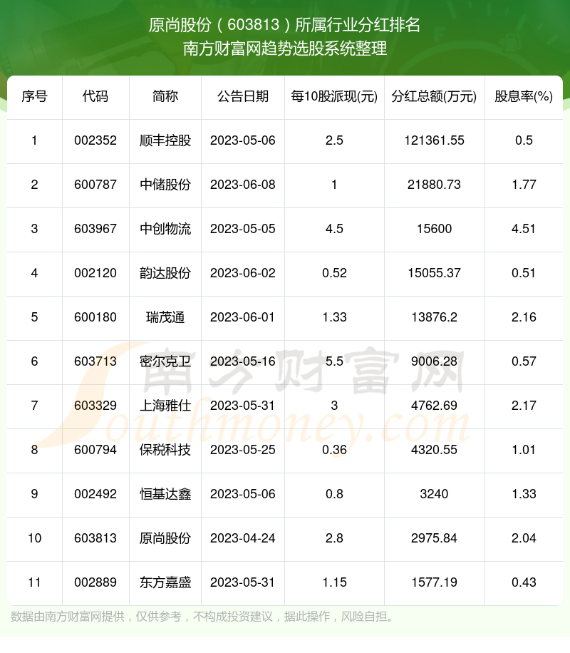 按照南方财富网趋势选股系统统计,原尚股份所属行业为物流行业行业,物流行业行业分红排名情况如下表:
