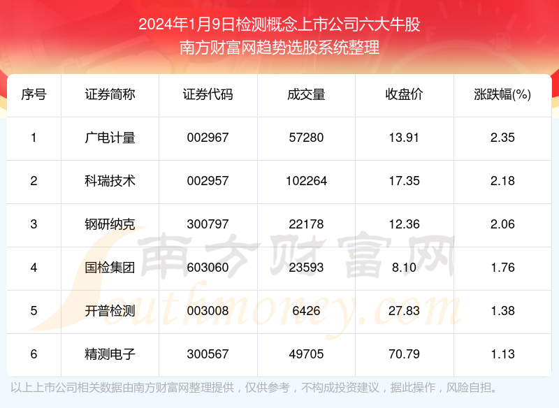 截止2024年1月9日,个股表现方面,检测概念上市公司当日领涨股为广电计量(002967),该股当日报收13.91,上涨2.35%,成交量5.73万。科瑞技术(002957)以上涨2.18%紧随其后,该股当日成交量10.23万。此外,钢研纳克(300797)、国检集团(603060)、开普检测(003008)均进入当日检测概念上市公司牛股之列。