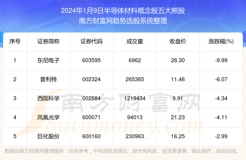 截止2024年1月9日,个股表现方面,半导体材料概念股当日领跌股为东尼电子(603595),该股当日报收28.30,上涨-9.99%,成交量0.7万。普利特(002324)以下跌-6.07%紧随其后,该股当日成交量26.54万。此外,西陇科学(002584)、凤凰光学(600071)、巨化股份(600160)均进入当日半导体材料概念股熊股之列。