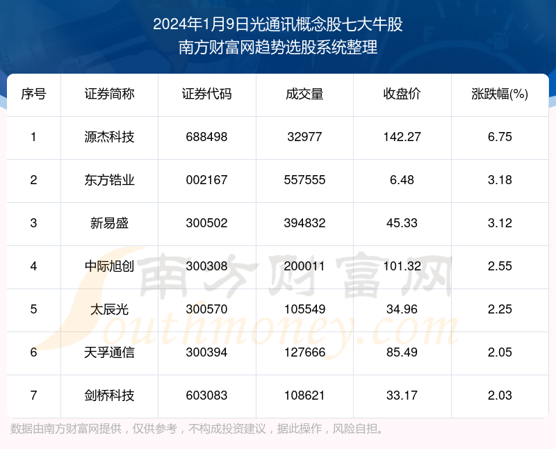 截止2024年1月9日,个股表现方面,光通讯概念股当日领涨股为源杰科技(688498),该股当日报收142.27,上涨6.75%,成交量3.3万。东方锆业(002167)以上涨3.18%紧随其后,该股当日成交量55.76万。此外,新易盛(300502)、中际旭创(300308)、太辰光(300570)均进入当日光通讯概念股牛股之列。