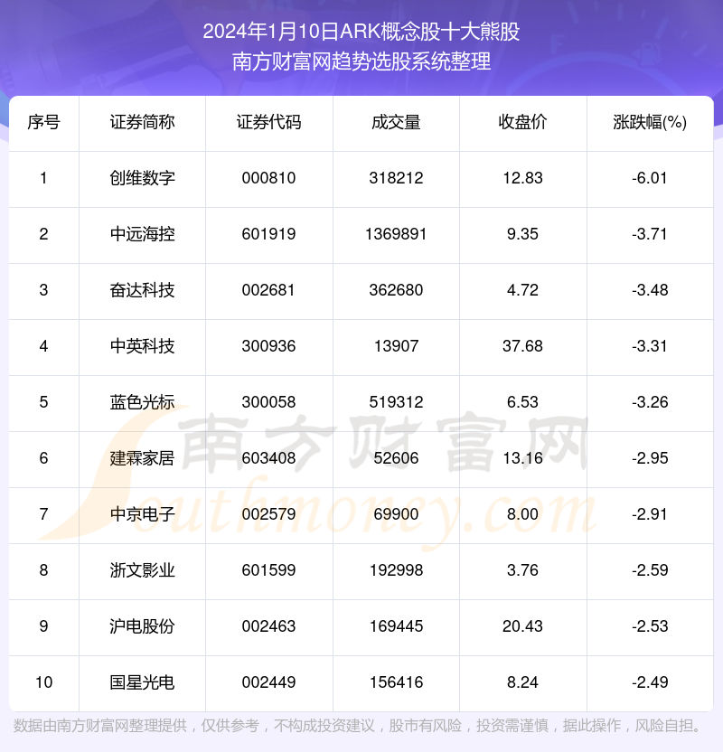 截止2024年1月10日,个股表现方面,ARK概念股当日领跌股为创维数字(000810),该股当日报收12.83,上涨-6.01%,成交量31.82万。中远海控(601919)以下跌-3.71%紧随其后,该股当日成交量136.99万。此外,奋达科技(002681)、中英科技(300936)、蓝色光标(300058)均进入当日ARK概念股熊股之列。