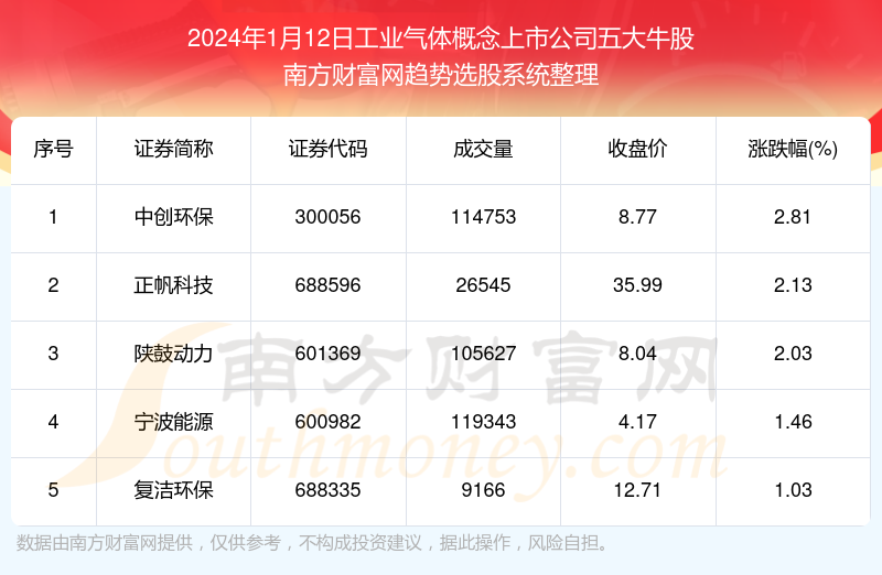 截止2024年1月12日,个股表现方面,工业气体概念上市公司当日领涨股为中创环保(300056),该股当日报收8.77,上涨2.81%,成交量11.48万。正帆科技(688596)以上涨2.13%紧随其后,该股当日成交量2.65万。此外,陕鼓动力(601369)、宁波能源(600982)、复洁环保(688335)均进入当日工业气体概念上市公司牛股之列。