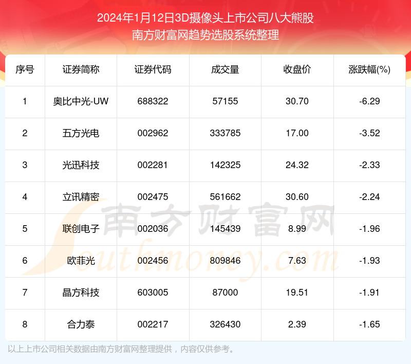 截止2024年1月12日,个股表现方面,3D摄像头上市公司当日领跌股为奥比中光-UW(688322),该股当日报收30.70,上涨-6.29%,成交量5.72万。五方光电(002962)以下跌-3.52%紧随其后,该股当日成交量33.38万。此外,光迅科技(002281)、立讯精密(002475)、联创电子(002036)均进入当日3D摄像头上市公司熊股之列。