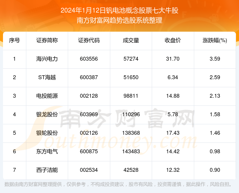 截止2024年1月12日,个股表现方面,钒电池概念股票当日领涨股为海兴电力(603556),该股当日报收31.70,上涨3.59%,成交量5.73万。ST海越(600387)以上涨2.59%紧随其后,该股当日成交量5.17万。此外,电投能源(002128)、银龙股份(603969)、银轮股份(002126)均进入当日钒电池概念股票牛股之列。