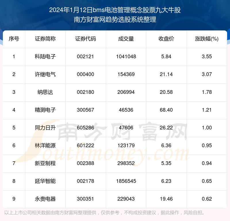 截止2024年1月12日,个股表现方面,bms电池管理概念股票当日领涨股为科陆电子(002121),该股当日报收5.84,上涨3.55%,成交量104.1万。许继电气(000400)以上涨3.07%紧随其后,该股当日成交量15.44万。此外,纳思达(002180)、精测电子(300567)、同力日升(605286)均进入当日bms电池管理概念股票牛股之列。