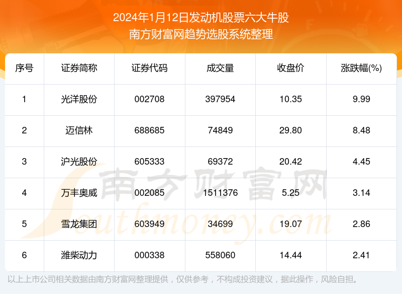截止2024年1月12日,个股表现方面,发动机股票当日领涨股为光洋股份(002708),该股当日报收10.35,上涨9.99%,成交量39.8万。迈信林(688685)以上涨8.48%紧随其后,该股当日成交量7.48万。此外,沪光股份(605333)、万丰奥威(002085)、雪龙集团(603949)均进入当日发动机股票牛股之列。