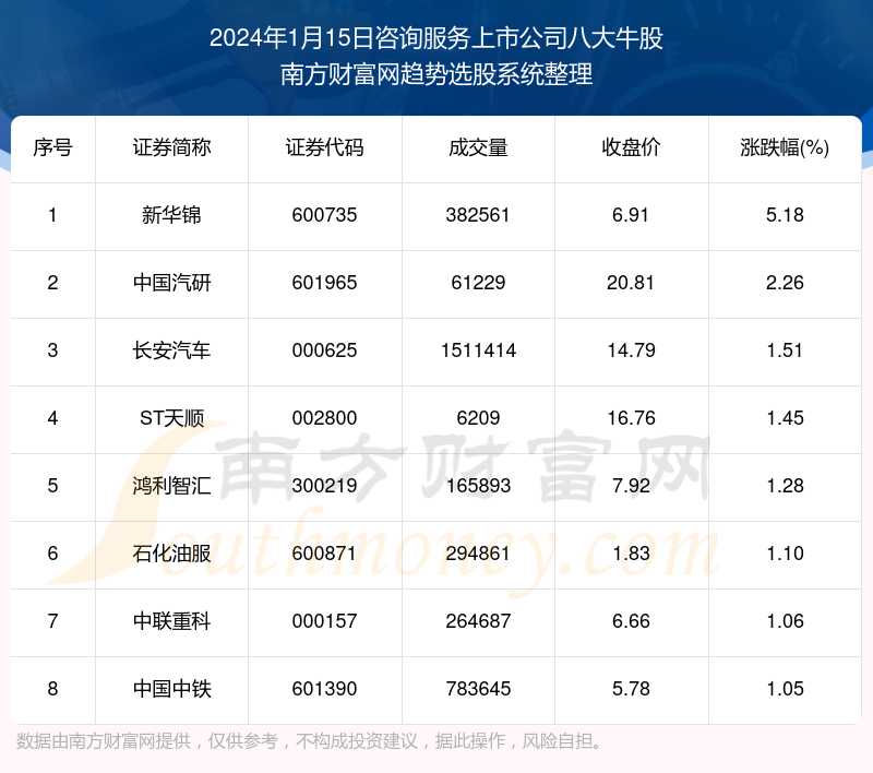 截止2024年1月15日,个股表现方面,咨询服务上市公司当日领涨股为新华锦(600735),该股当日报收6.91,上涨5.18%,成交量38.26万。中国汽研(601965)以上涨2.26%紧随其后,该股当日成交量6.12万。此外,长安汽车(000625)、ST天顺(002800)、鸿利智汇(300219)均进入当日咨询服务上市公司牛股之列。