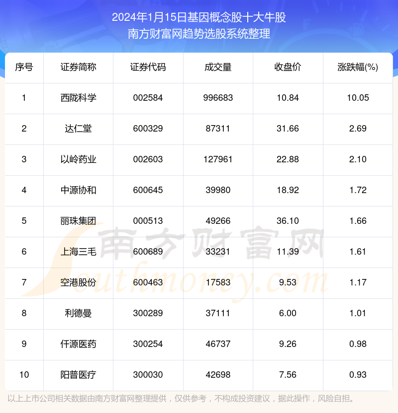 截止2024年1月15日,个股表现方面,基因概念股当日领涨股为西陇科学(002584),该股当日报收10.84,上涨10.05%,成交量99.67万。达仁堂(600329)以上涨2.69%紧随其后,该股当日成交量8.73万。此外,以岭药业(002603)、中源协和(600645)、丽珠集团(000513)均进入当日基因概念股牛股之列。