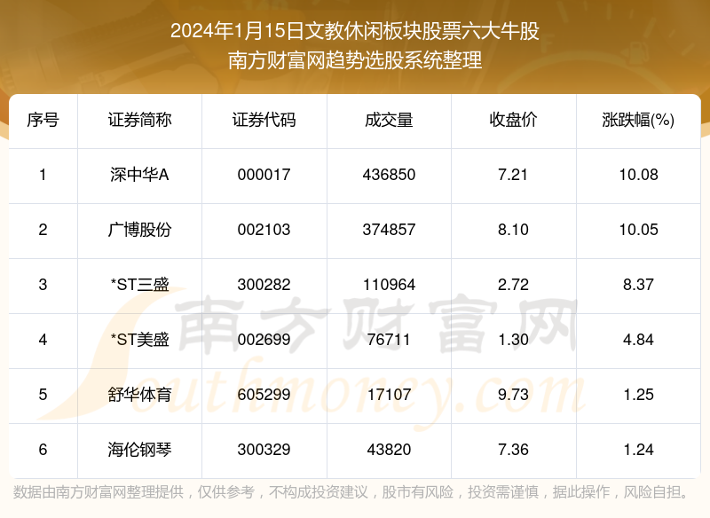 截止2024年1月15日,个股表现方面,文教休闲板块股票当日领涨股为深中华A(000017),该股当日报收7.21,上涨10.08%,成交量43.69万。广博股份(002103)以上涨10.05%紧随其后,该股当日成交量37.49万。此外,*ST三盛(300282)、*ST美盛(002699)、舒华体育(605299)均进入当日文教休闲板块股票牛股之列。