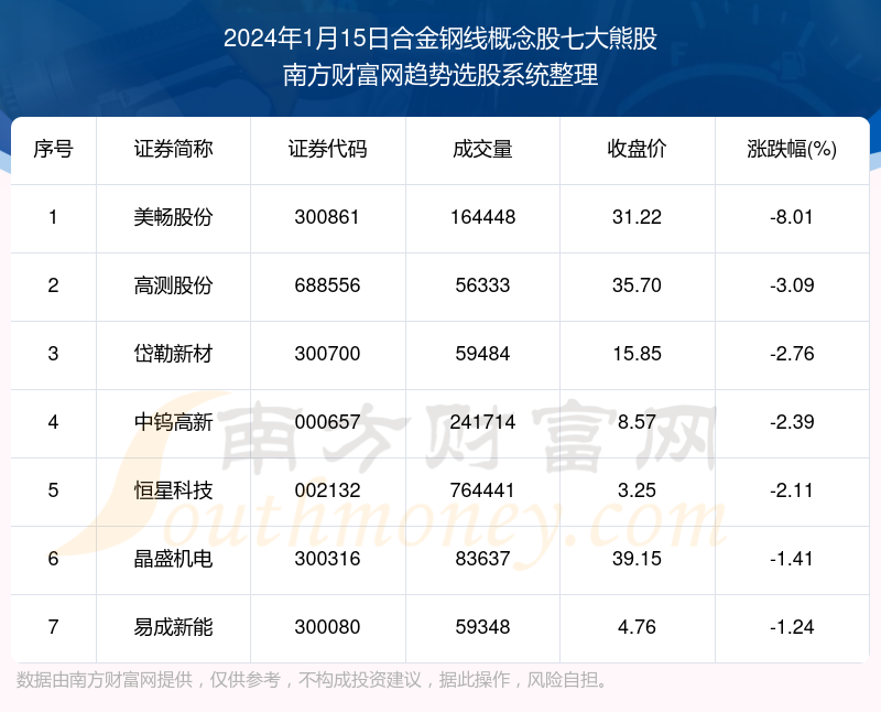 截止2024年1月15日,个股表现方面,合金钢线概念股当日领跌股为美畅股份(300861),该股当日报收31.22,上涨-8.01%,成交量16.44万。高测股份(688556)以下跌-3.09%紧随其后,该股当日成交量5.63万。此外,岱勒新材(300700)、中钨高新(000657)、恒星科技(002132)均进入当日合金钢线概念股熊股之列。