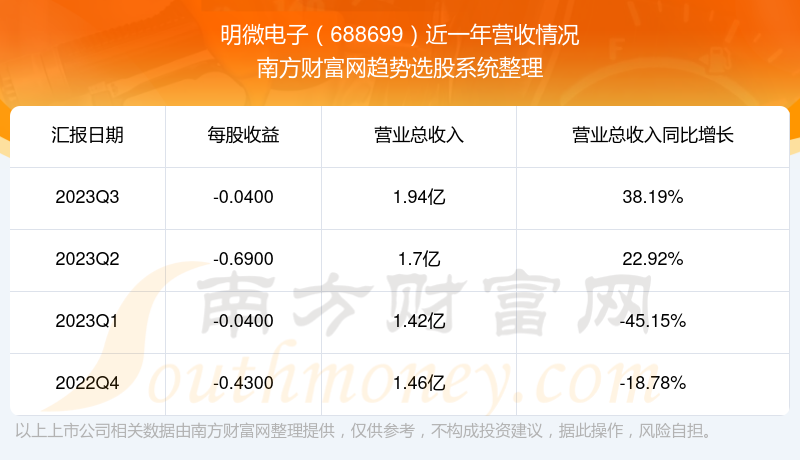 明微电子2023年第三季度显示,公司主营收入1.94亿元,同比38.19%;归母净利润-415.6万元,同比87.82%;扣非净利润-1051.79万元,同比76.75%;