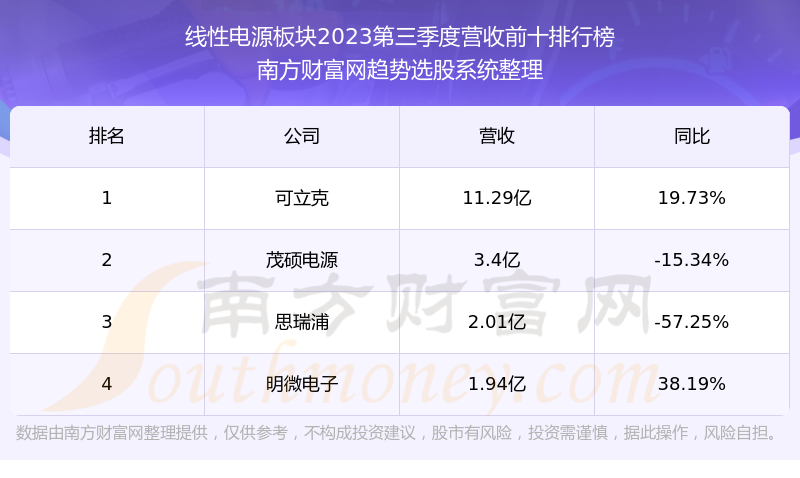 按照南方财富网趋势选股系统统计,该股所属板块为线性电源板块,该板块共有4只股票,明微电子2023第三季度营收在该板块中排名为第4名,该板块2023第三季度营收排名前十的股票如下表: