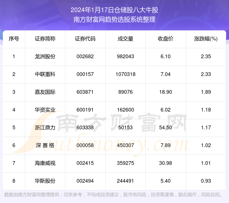 截止2024年1月17日,个股表现方面,仓储股当日领涨股为龙洲股份(002682),该股当日报收6.10,上涨2.35%,成交量98.2万。中联重科(000157)以上涨2.33%紧随其后,该股当日成交量107.03万。此外,嘉友国际(603871)、华资实业(600191)、浙江鼎力(603338)均进入当日仓储股牛股之列。