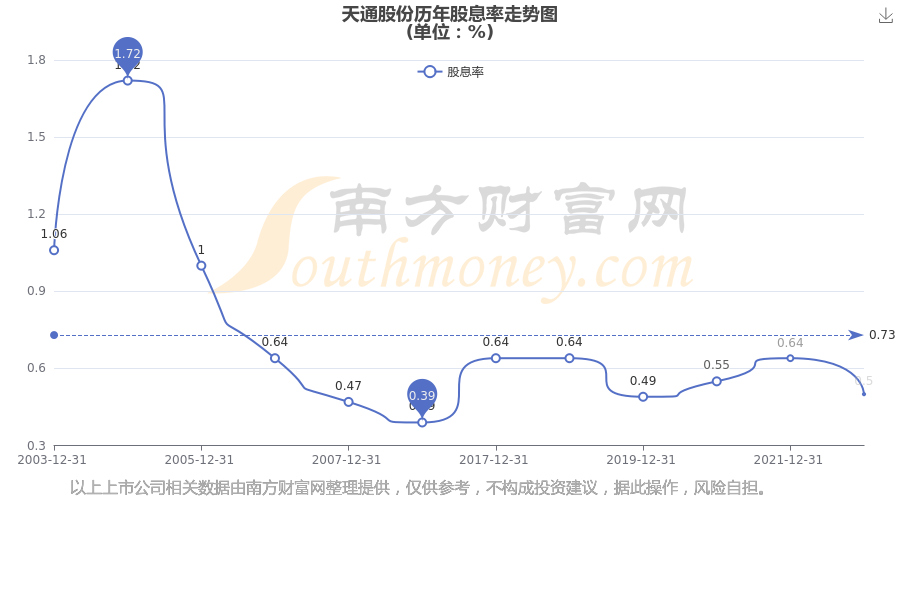 天通股份最新一次公布的分红方案为10派0.5元。本次权益分派股权登记日为2023年5月23日,除权除息日为2023年5月24日,派息日为2023年5月24日。