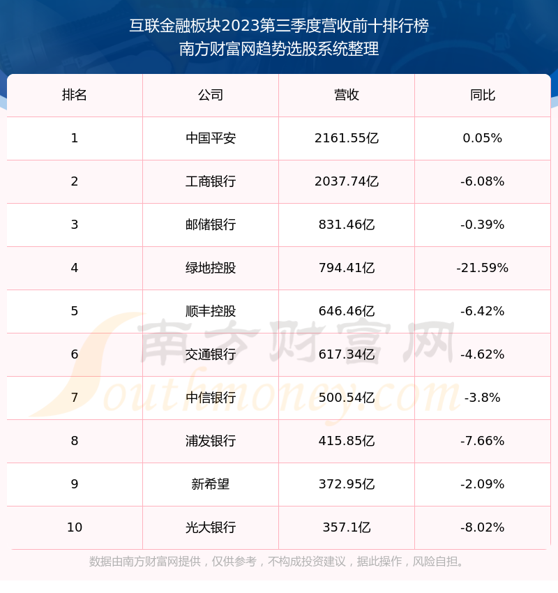 按照南方财富网趋势选股系统统计,该股所属板块为互联金融板块,该板块共有238只股票,爱建集团2023第三季度营收在该板块中排名为第146名,该板块2023第三季度营收排名前十的股票如下表: