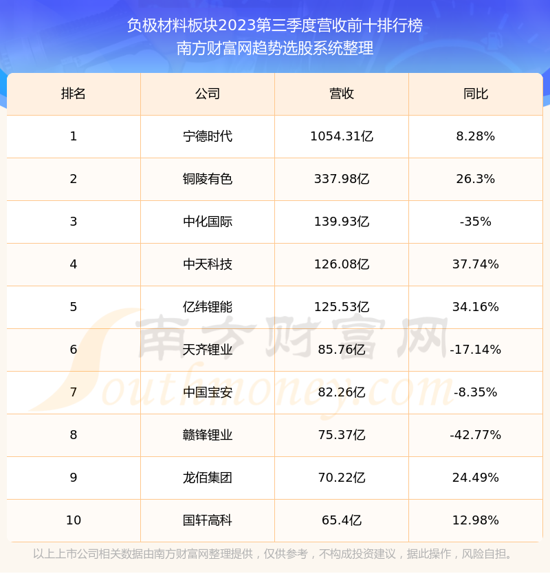 按照南方财富网趋势选股系统统计,该股所属板块为负极材料板块,该板块共有51只股票,璞泰来2023第三季度营收在该板块中排名为第16名,该板块2023第三季度营收排名前十的股票如下表: