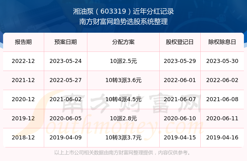 湘油泵最新一次公布的分红方案为10派2.5元。本次权益分派股权登记日为2023年5月29日,除权除息日为2023年5月30日,派息日为2023年5月30日。
