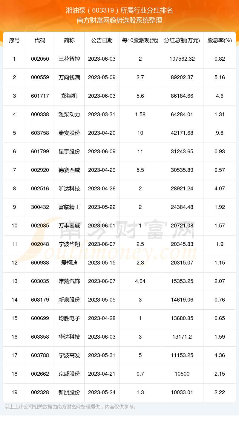 按照南方财富网趋势选股系统统计,湘油泵所属行业为机油泵行业,机油泵行业分红排名情况如下表: