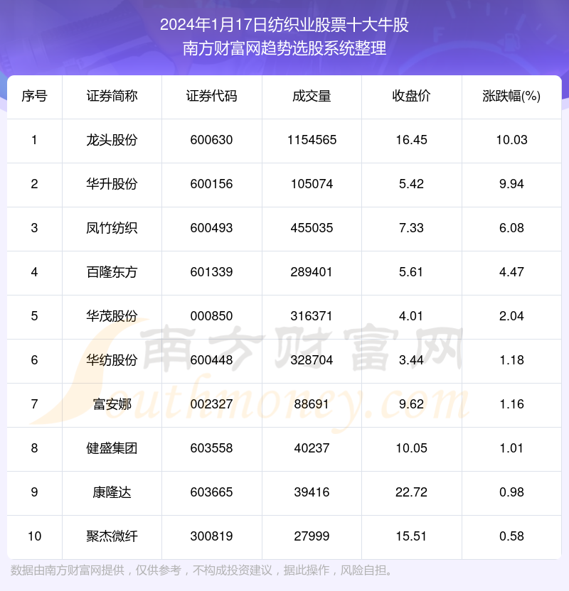 截止2024年1月17日,个股表现方面,纺织业股票当日领涨股为龙头股份(600630),该股当日报收16.45,上涨10.03%,成交量115.46万。华升股份(600156)以上涨9.94%紧随其后,该股当日成交量10.51万。此外,凤竹纺织(600493)、百隆东方(601339)、华茂股份(000850)均进入当日纺织业股票牛股之列。