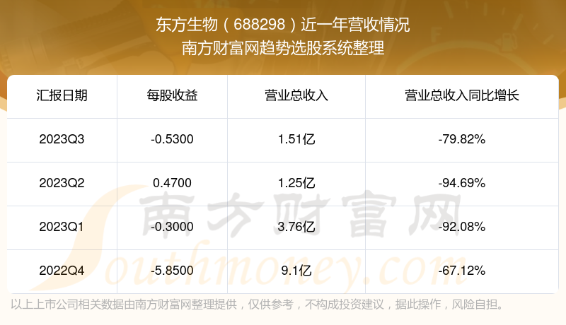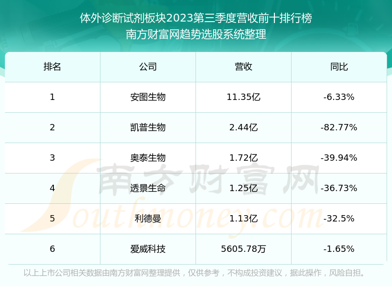 按照南方财富网趋势选股系统统计,该股所属板块为体外诊断试剂板块,该板块共有6只股票,东方生物2023第三季度营收在该板块中排名为第6名,该板块2023第三季度营收排名前十的股票如下表: