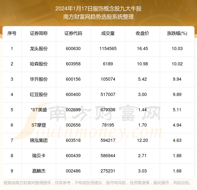 截止2024年1月17日,个股表现方面,服饰概念股当日领涨股为龙头股份(600630),该股当日报收16.45,上涨10.03%,成交量115.46万。哈森股份(603958)以上涨10.02%紧随其后,该股当日成交量0.62万。此外,华升股份(600156)、红豆股份(600400)、*ST美盛(002699)均进入当日服饰概念股牛股之列。