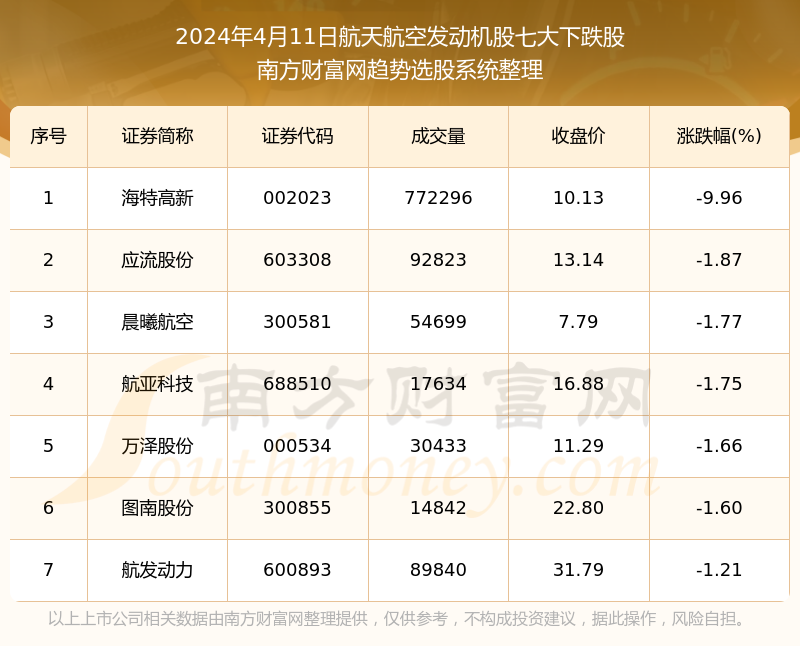 截止2024年4月11日,个股表现方面,航天航空发动机股当日领跌股为海特高新(002023),该股当日报收10.13,上涨-9.96%,成交量77.23万。应流股份(603308)以下跌-1.87%紧随其后,该股当日成交量9.28万。此外,晨曦航空(300581)、航亚科技(688510)、万泽股份(000534)均进入当日航天航空发动机股下跌股之列。