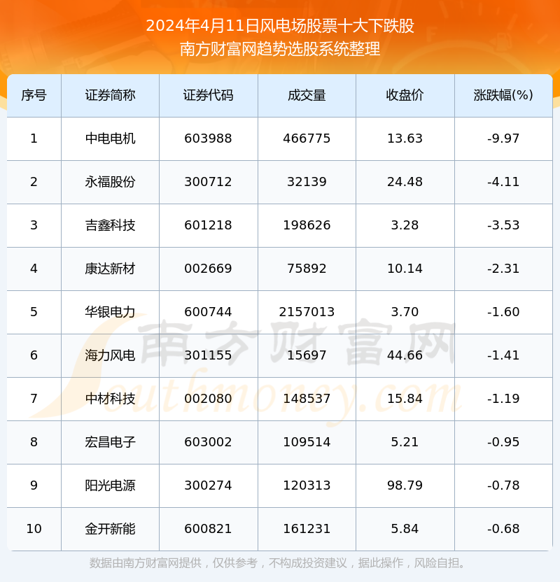 截止2024年4月11日,个股表现方面,风电场股票当日领跌股为中电电机(603988),该股当日报收13.63,上涨-9.97%,成交量46.68万。永福股份(300712)以下跌-4.11%紧随其后,该股当日成交量3.21万。此外,吉鑫科技(601218)、康达新材(002669)、华银电力(600744)均进入当日风电场股票下跌股之列。
