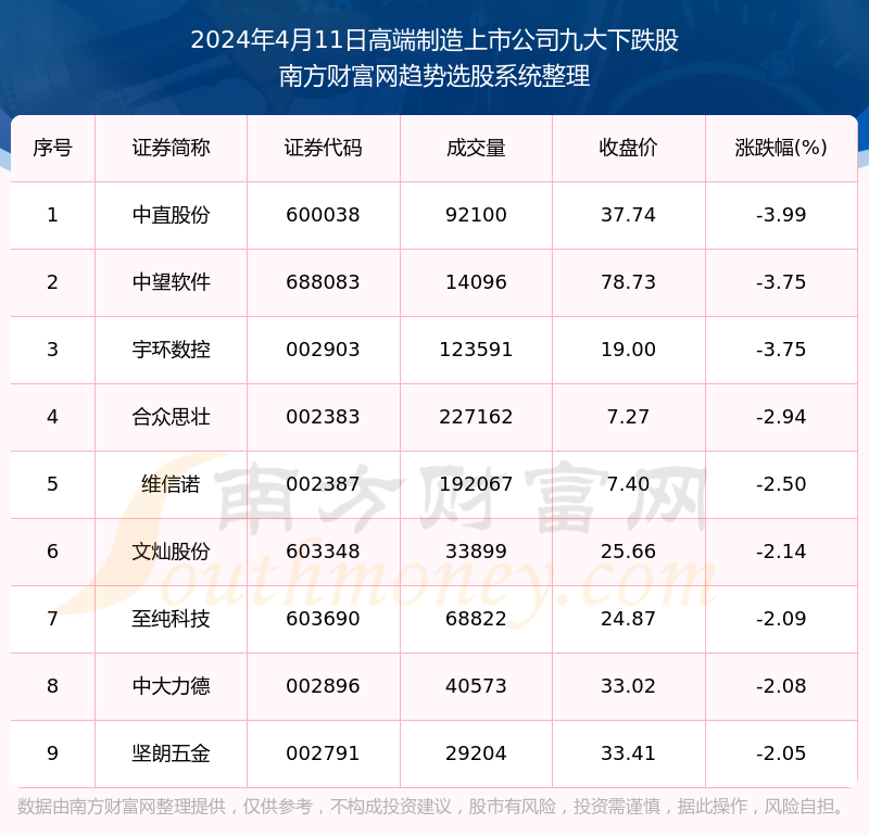 截止2024年4月11日,个股表现方面,高端制造上市公司当日领跌股为中直股份(600038),该股当日报收37.74,上涨-3.99%,成交量9.21万。中望软件(688083)以下跌-3.75%紧随其后,该股当日成交量1.41万。此外,宇环数控(002903)、合众思壮(002383)、维信诺(002387)均进入当日高端制造上市公司下跌股之列。