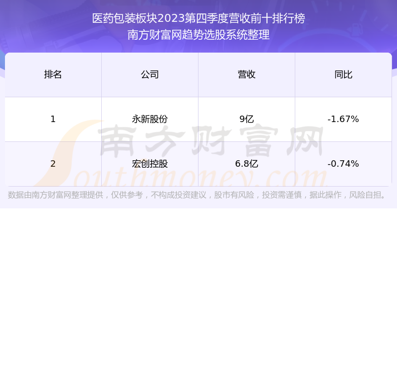 按照南方财富网趋势选股系统统计,该股所属板块为医药包装板块,该板块共有2只股票,华强科技2023第四季度营收在该板块中排名为第2名,该板块2023第四季度营收排名前十的股票如下表: