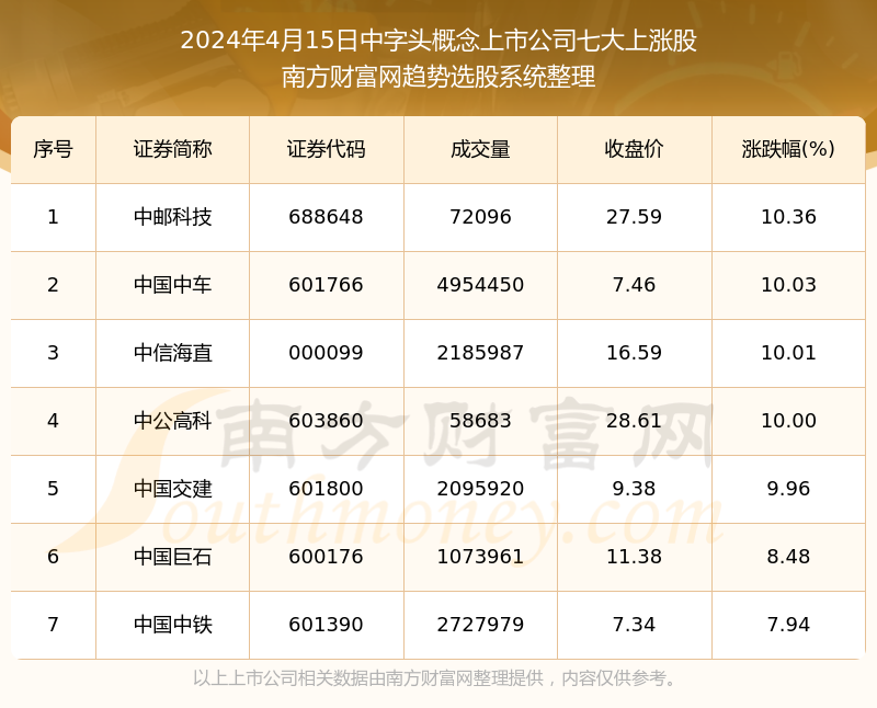 截止2024年4月15日,个股表现方面,中字头概念上市公司中,中邮科技(688648)当日报收27.59,上涨10.36%,成交量7.21万。中国中车(601766)以上涨10.03%紧随其后,该股当日成交量495.45万。此外,中信海直(000099)、中公高科(603860)、中国交建(601800)均进入当日中字头概念上市公司上涨股之列。