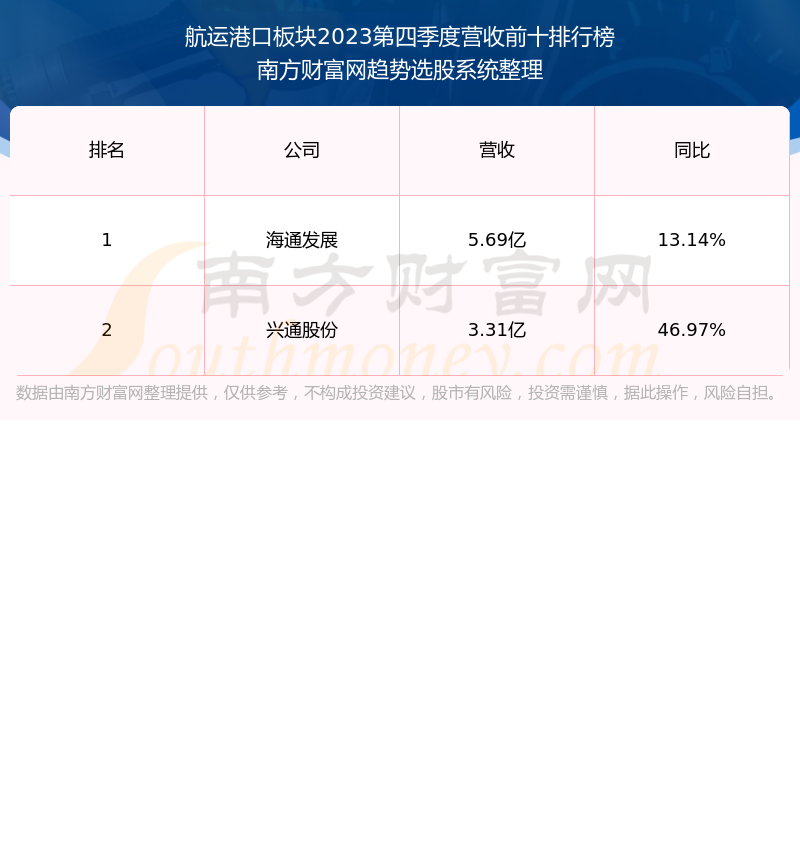 按照南方财富网趋势选股系统统计,该股所属板块为航运港口板块,该板块共有2只股票,连云港2023第四季度营收在该板块中排名为第2名,该板块2023第四季度营收排名前十的股票如下表:
