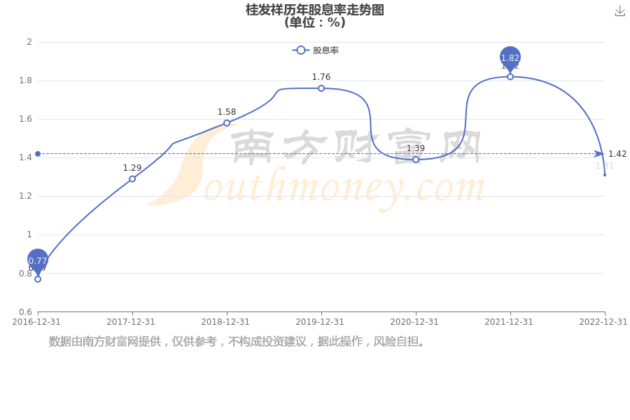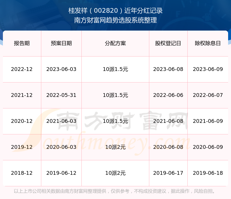 桂发祥最新一次公布的分红方案为10派1.5元。本次权益分派股权登记日为2023年6月8日,除权除息日为2023年6月9日,派息日为2023年6月9日。