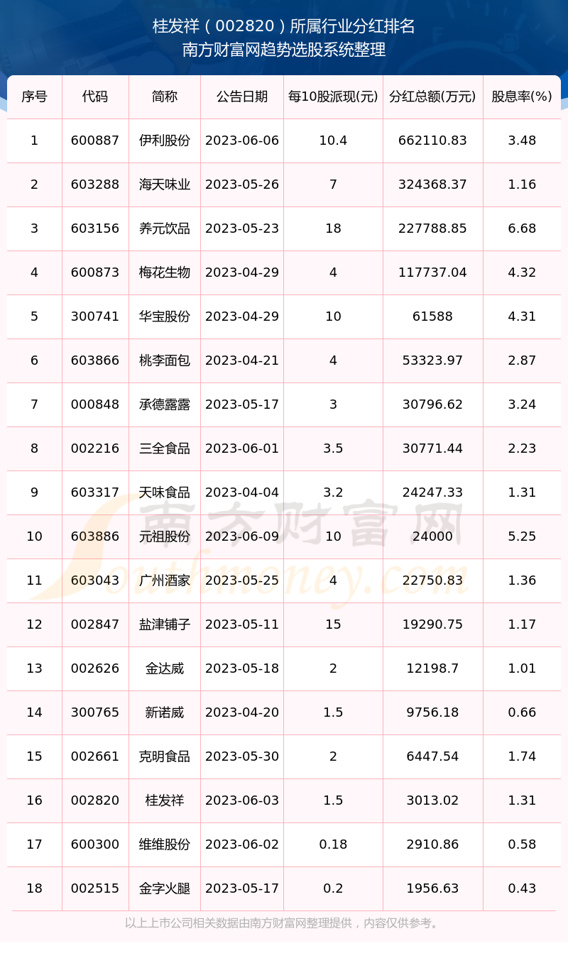 按照南方财富网趋势选股系统统计,桂发祥所属行业为食品饮料行业,食品饮料行业分红排名情况如下表:
