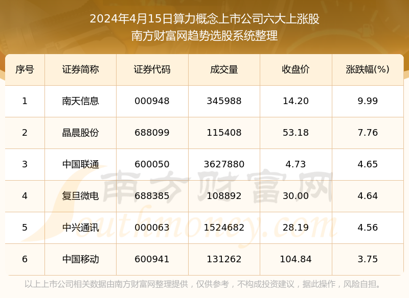 截止2024年4月15日,个股表现方面,算力概念上市公司中,南天信息(000948)当日报收14.20,上涨9.99%,成交量34.6万。晶晨股份(688099)以上涨7.76%紧随其后,该股当日成交量11.54万。此外,中国联通(600050)、复旦微电(688385)、中兴通讯(000063)均进入当日算力概念上市公司上涨股之列。