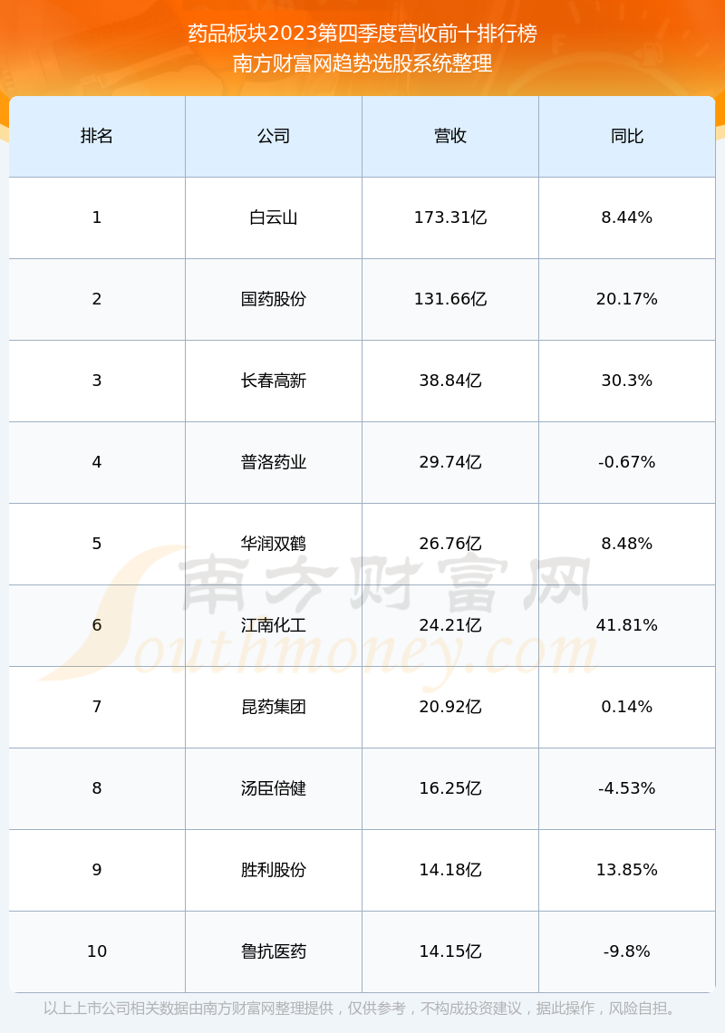 按照南方财富网趋势选股系统统计,该股所属板块为药品板块,该板块共有29只股票,江苏吴中2023第四季度营收在该板块中排名为第29名,该板块2023第四季度营收排名前十的股票如下表: