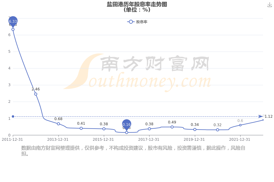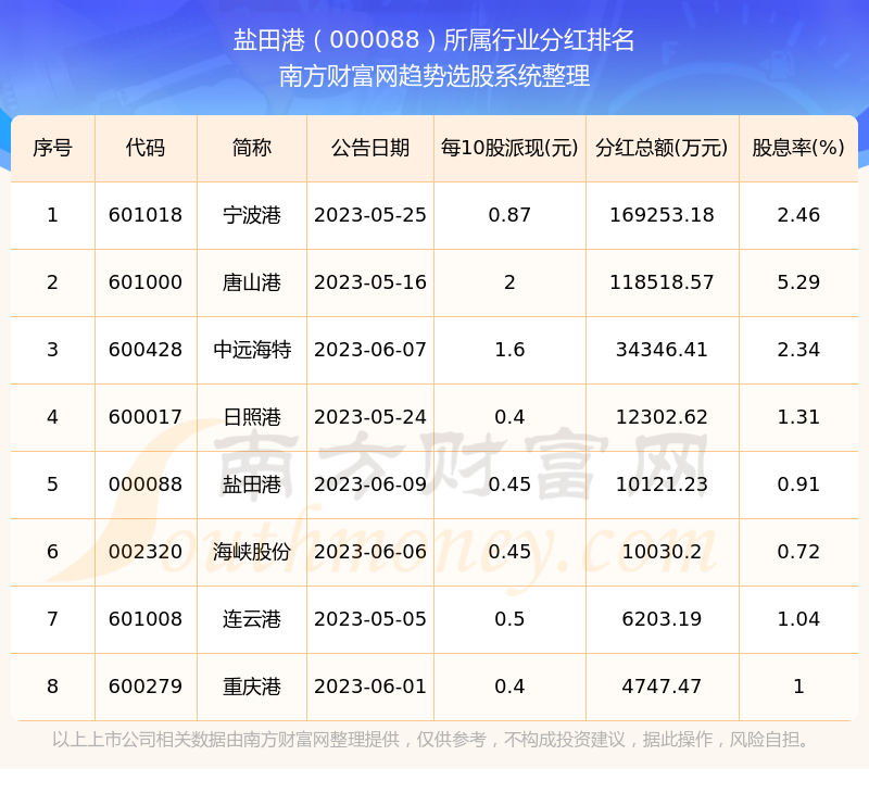按照南方财富网趋势选股系统统计,盐田港所属行业为航运港口行业,航运港口行业分红排名情况如下表: