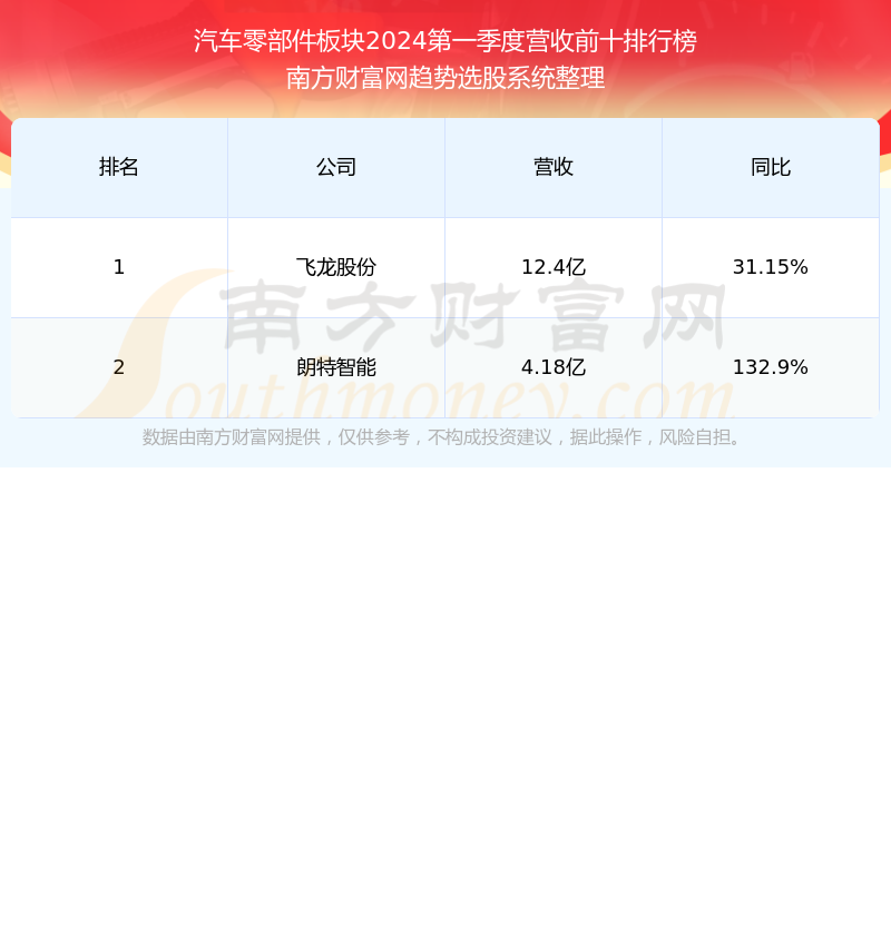 按照南方财富网趋势选股系统统计,该股所属板块为汽车零部件板块,该板块共有2只股票,金帝股份2024第一季度营收在该板块中排名为第2名,该板块2024第一季度营收排名前十的股票如下表: