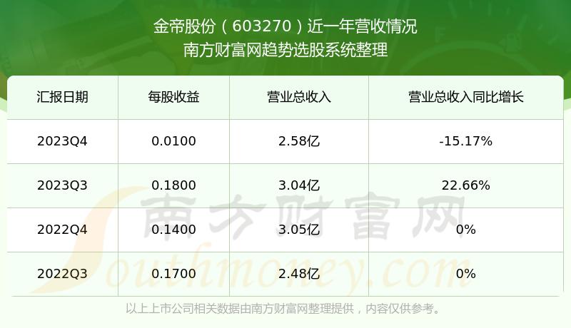 金帝股份股票近一年营收情况如下表:
