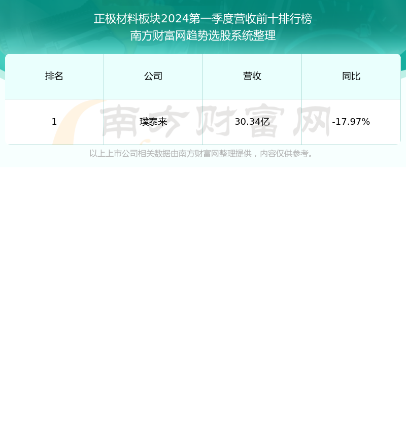 按照南方财富网趋势选股系统统计,该股所属板块为正极材料板块,该板块共有1只股票,容百科技2024第一季度营收在该板块中排名为第1名,该板块2024第一季度营收排名前十的股票如下表: