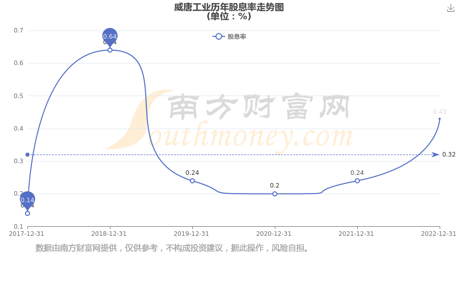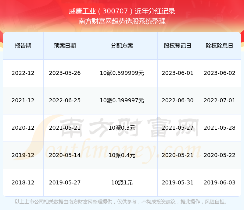 威唐工业最新一次公布的分红方案:10派0.599999元。