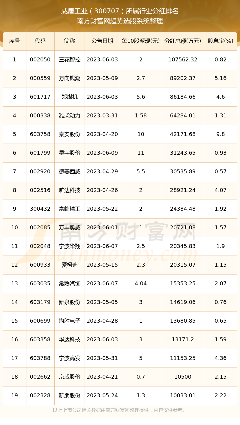 按照南方财富网趋势选股系统统计,威唐工业所属行业为汽车零部件行业,汽车零部件行业分红排名情况如下表: