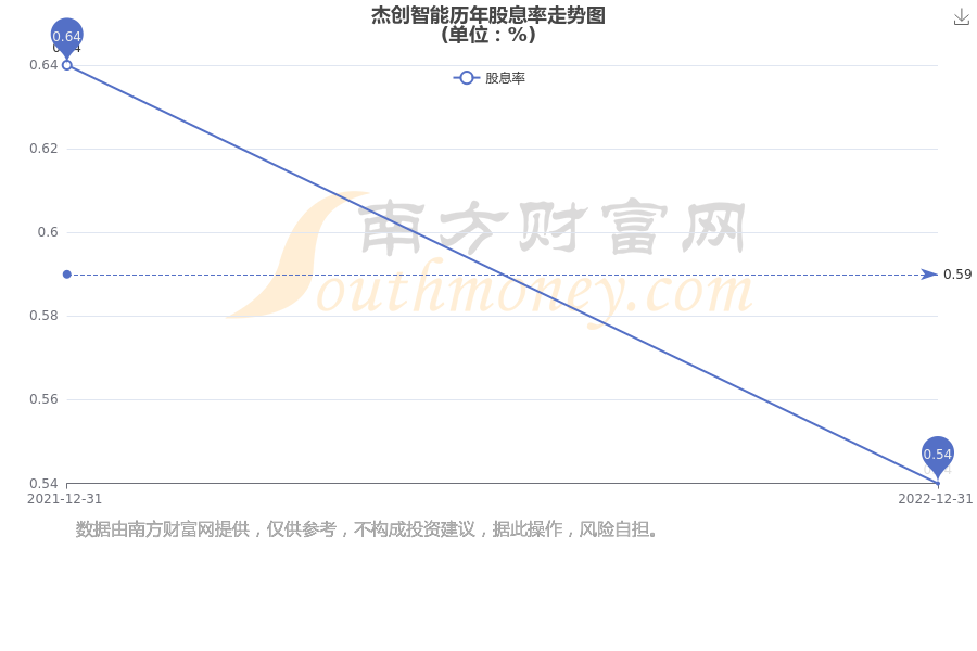 杰创智能最新一次公布的分红方案为10转5派2元。本次权益分派股权登记日为2023年5月31日,除权除息日为2023年6月1日,派息日为2023年6月1日。