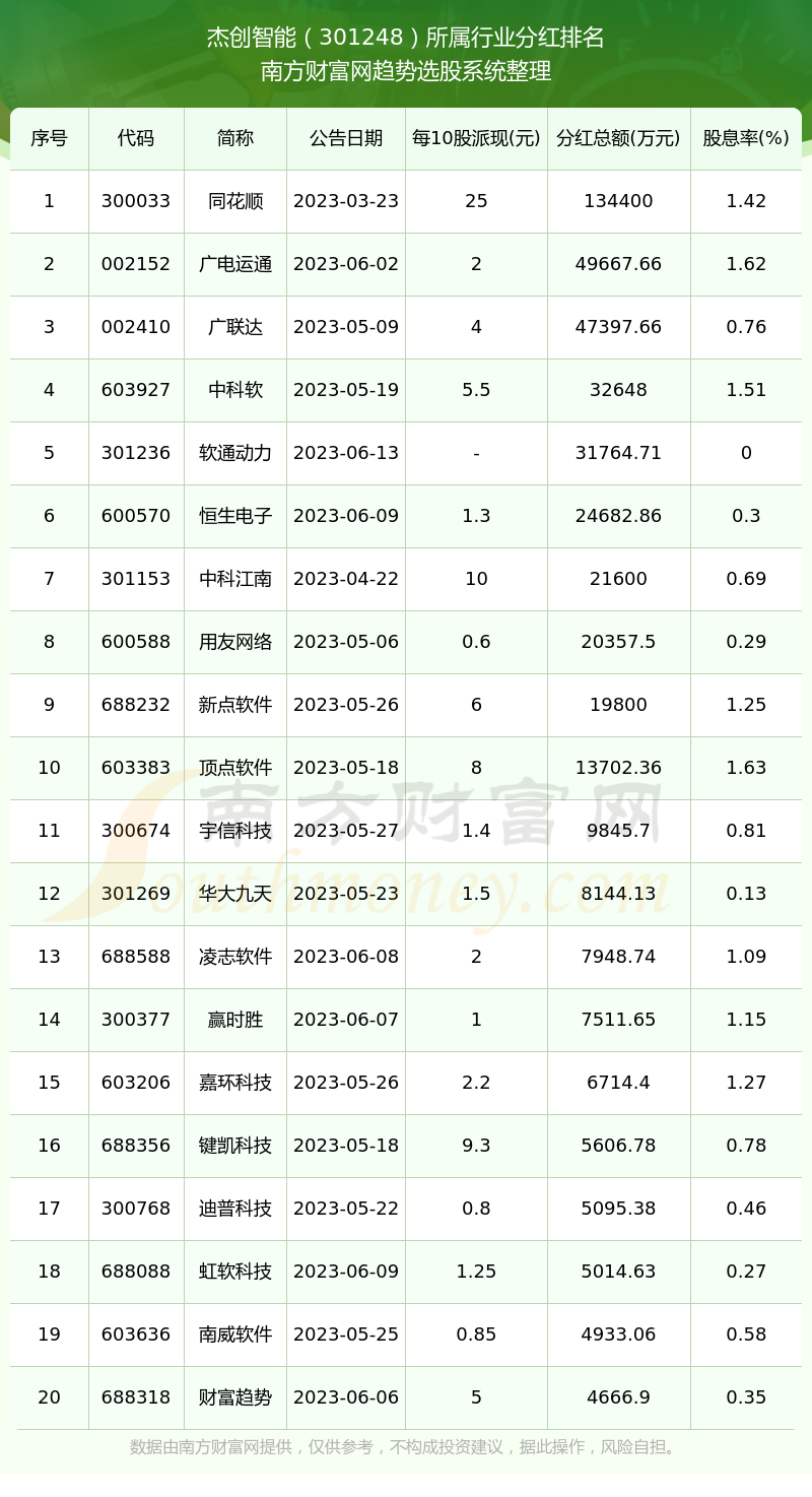 按照南方财富网趋势选股系统统计,杰创智能所属行业为软件开发行业,软件开发行业分红排名情况如下表:
